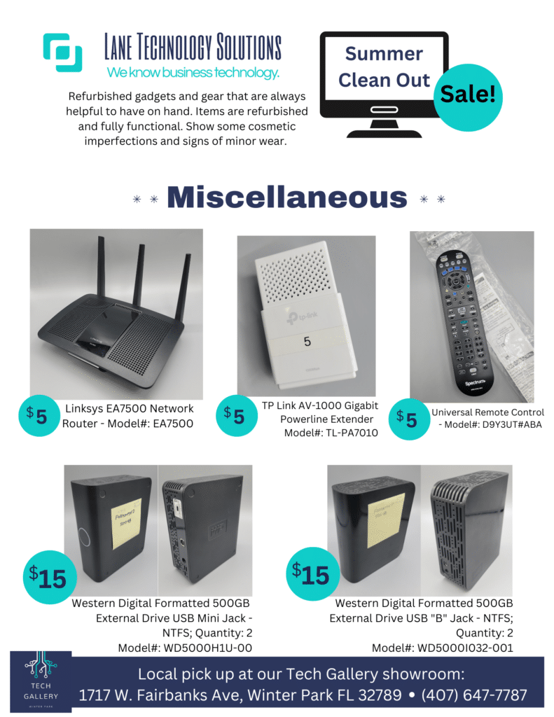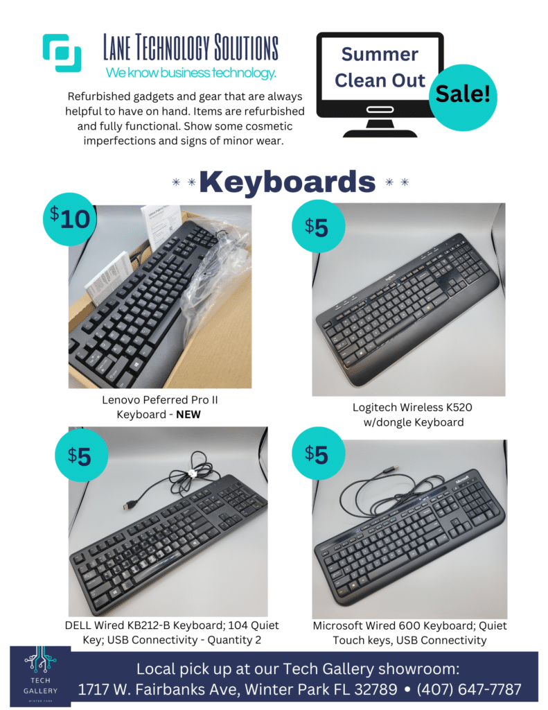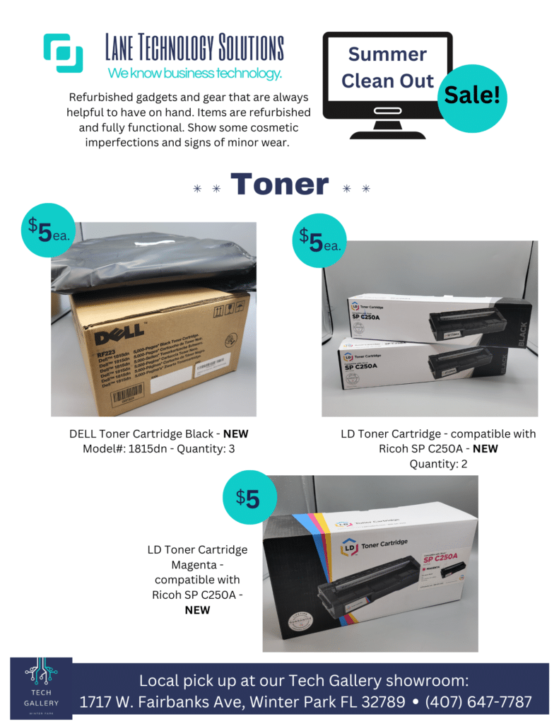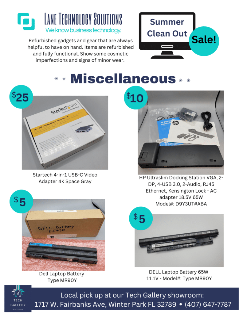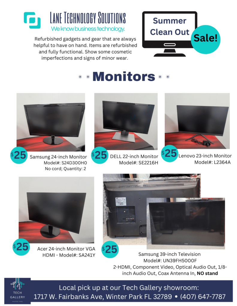 Don’t miss Nala’s Nifty Thrifty Thursday summer sale! Explore a wide range of refurbished gadgets and gear on clearance, including monitors, keyboards, toners, and more. These fully functional items are not only useful but also smart choices. Check out the amazing deals below and come visit us Tech Gallery at 1717 W. Fairbanks Ave, Winter Park, FL 32789.