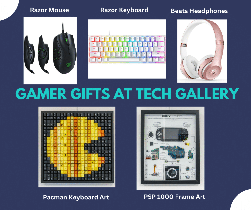Are you looking for a gift to buy that special gamer in your life? Look no further, Tech Gallery has you covered! We have gifts available ranging from unique artwork to specialized mice and keyboards. Check out a few of our products in the image above, and come visit Tech